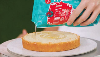 Recorta el pack y dosifica el humectante sobre la capa de bizcochuelo o torta justo antes de rellenarlo.