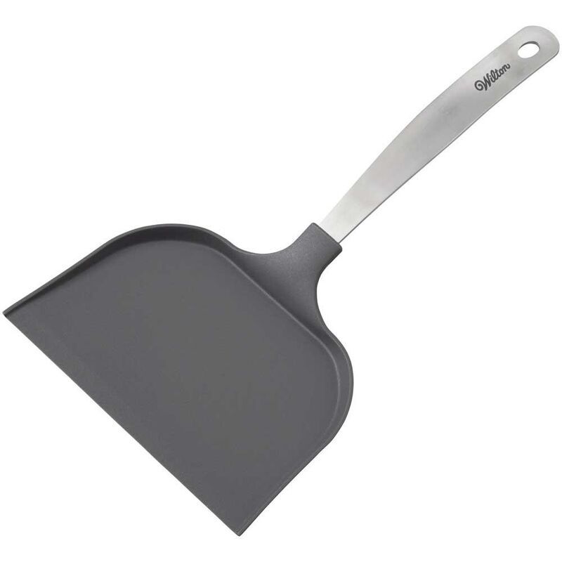 Ahorre tiempo y obtenga más de todo, desde galletas hasta aperitivos con esta espátula extra ancha. Seguro para sartenes antiadherentes. La espátula gris presenta un mango de acero inoxidable..