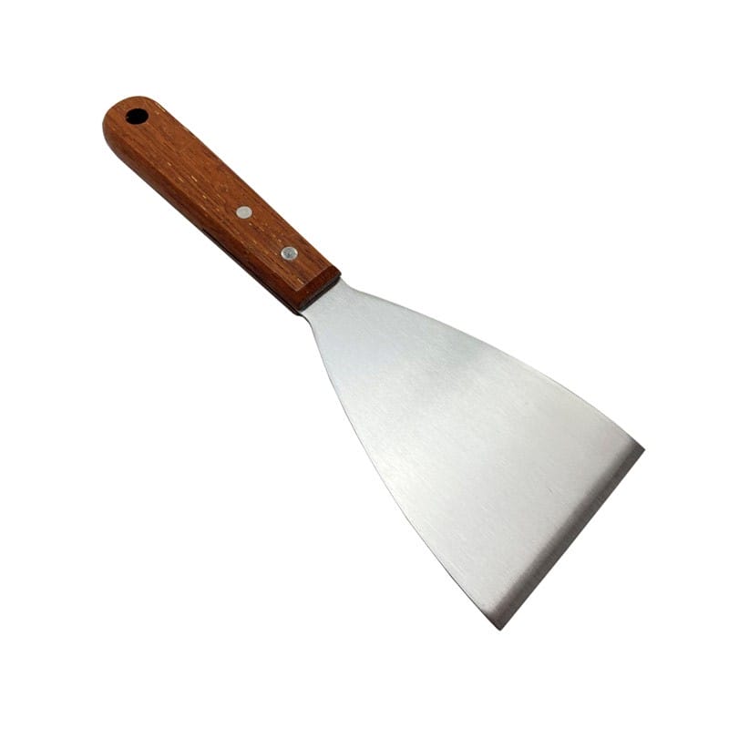 Espátula para plancha con pala en forma triangular de acero inoxidable y mango de madera remachado. Perfecta para voltear alimentos en la plancha o parrilla.