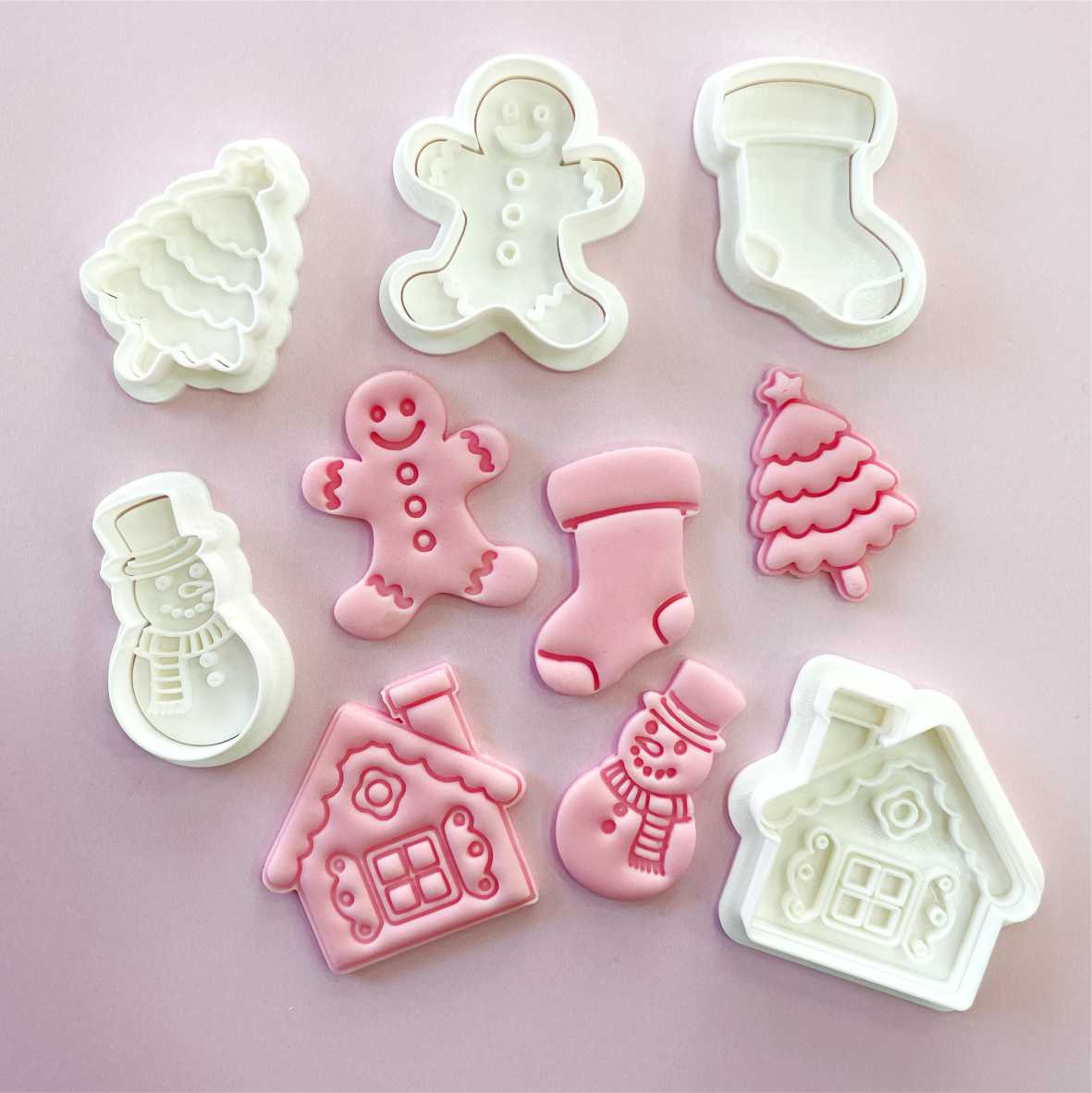 Kit de 5 mini cortantes de Navidad de 5cm de alto con Marcador, incluye: Hombre de Jengibre, Muñeco de Nieve, Media, Casa de Azúcar y pino