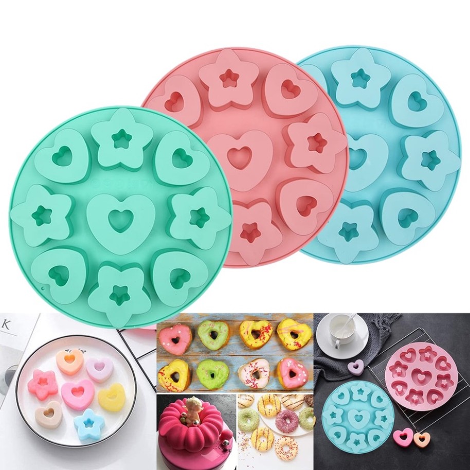 Molde de silicona redondo con 9 cavidades con forma de corazón y estrellas con tubo