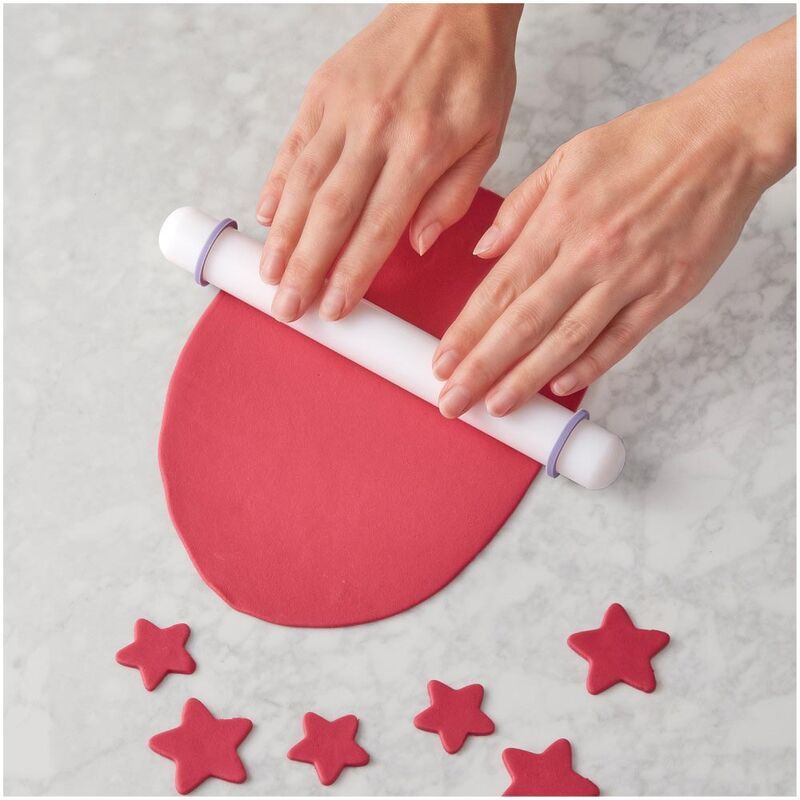 Rodillo plástico de 23 cm. con anillos niveladores. ¡Extiende pasta de goma y fondant al grosor ideal cada vez! Este rodillo de 22,8 cm. es perfecto para pequeñas cantidades de fondant e incluye anillos guía para ayudar a eliminar desniveles.