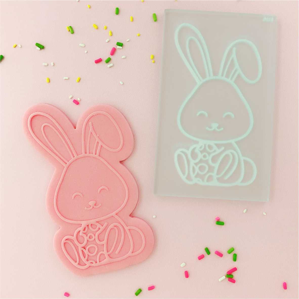 Simple y rápido de utilizar! Solo tenes que estirar pasta, apoyar el sello, hacer presión con un fratacho rígido y retirarlo! Te recomendamos que utilices el cortante de contorno para Conejo Feliz!