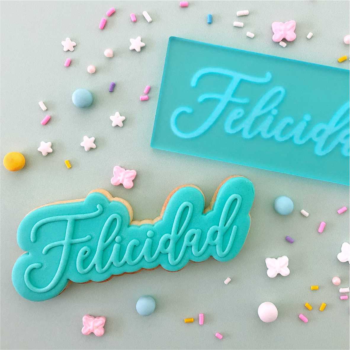 Simple y rápido de utilizar! Solo tenes que estirar pasta, apoyar el sello, hacer presión con un fratacho rígido y retirarlo! Te recomendamos que utilices el cortante de contorno para Sello Felicidad!