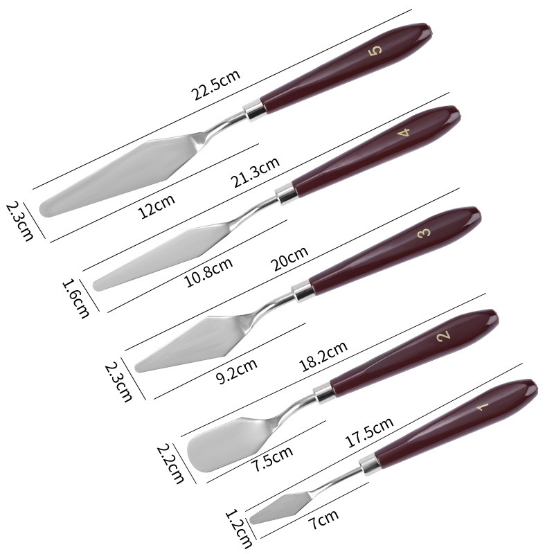 Set 5 espátulas para óleo de diferentes formas y tamaños con mango madera