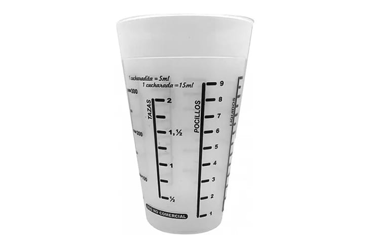 Pocillos: 9. Liquidos: 700cc. Harina 400 grs. Arroz: 600grs.