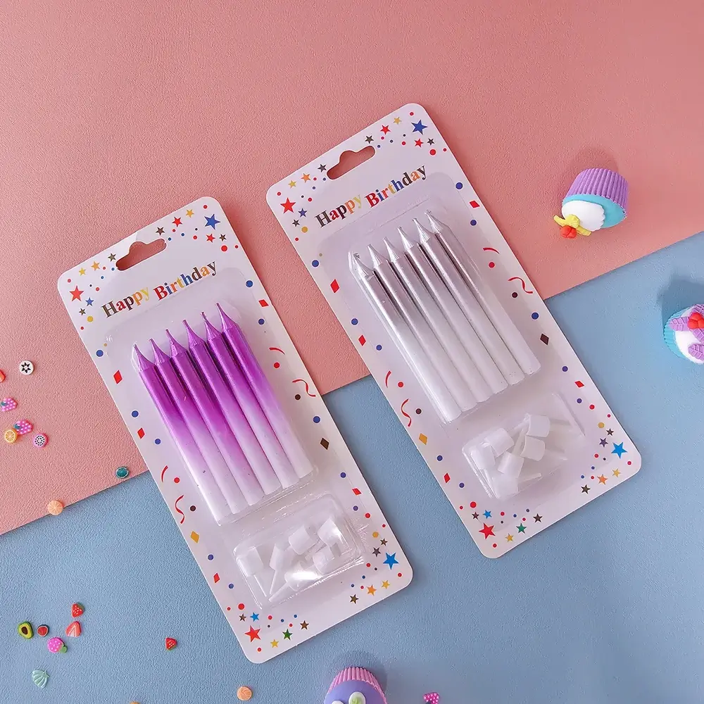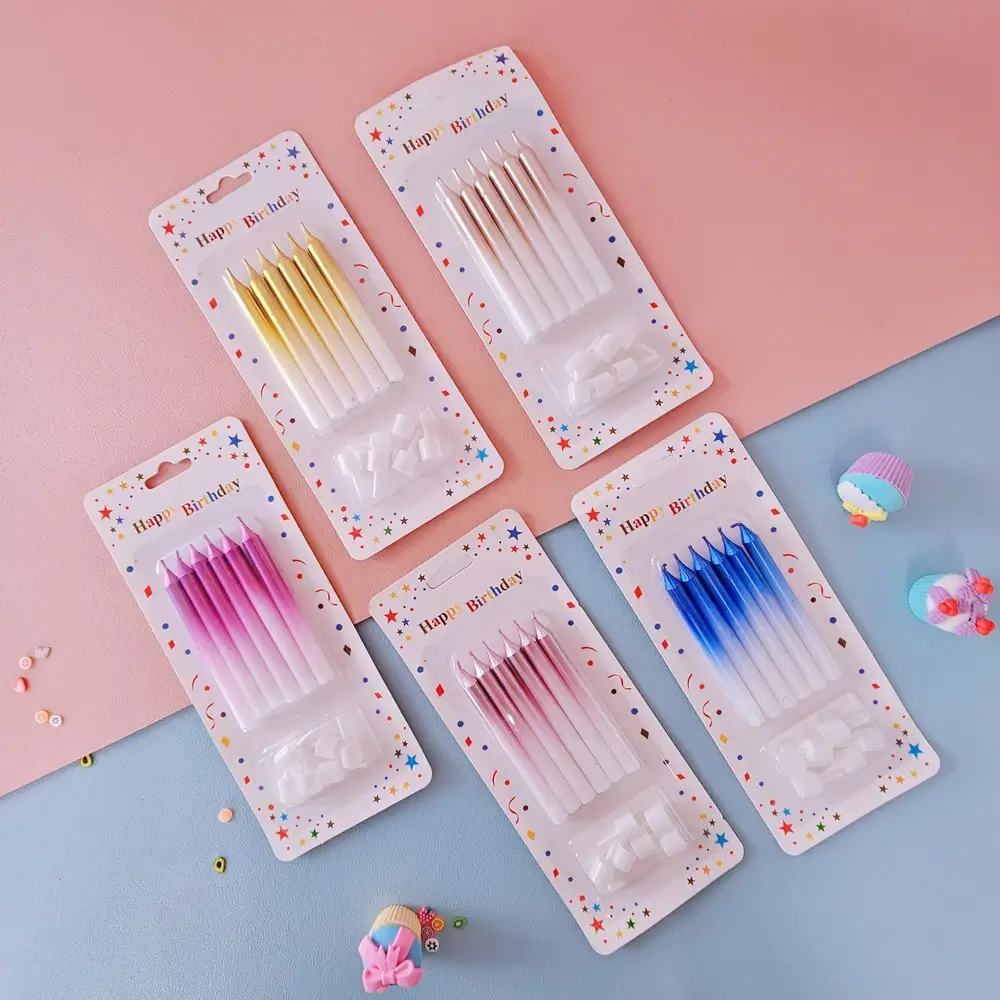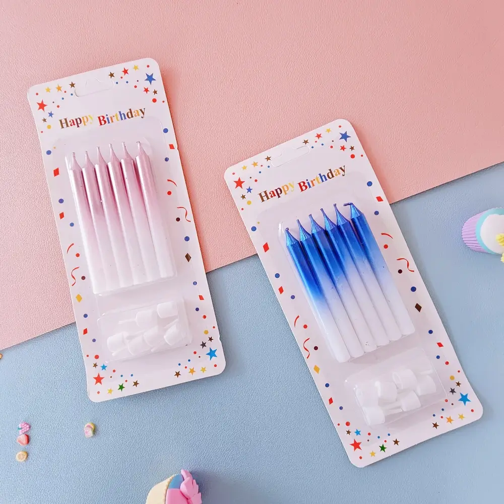 (Blíster de seis velas de distintos colores vibrantes y hermosos).